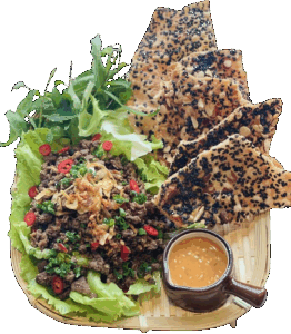 Thịt bồ câu băm mềm thơm, trộn cùng rau củ và xốt mè rang Kewpie béo nhẹ, thêm chút tương ớt cay dịu để dậy vị. Ăn kèm bánh đa Kế giòn tan tạo nên sự hòa quyện giữa độ mềm – giòn, mặn – cay đầy cuốn hút.
