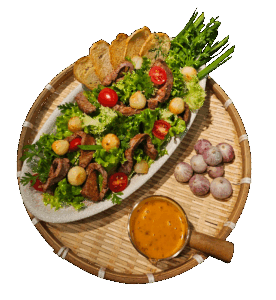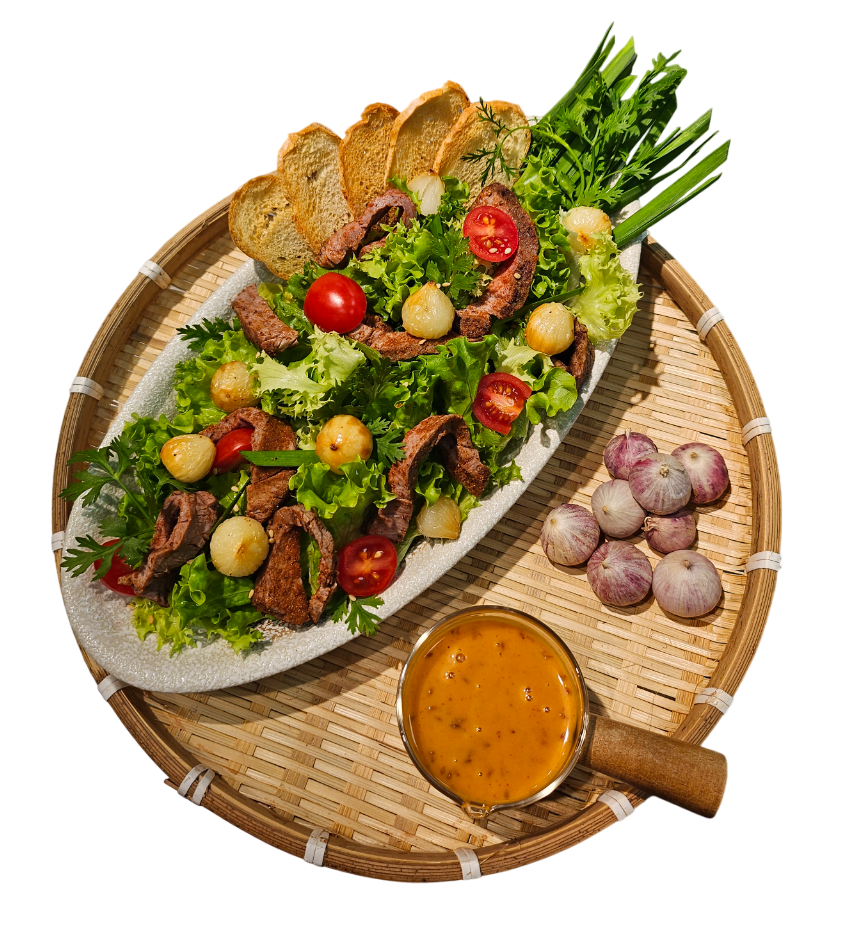 Món salad là sự hòa quyện giữa tỏi Lý Sơn nướng thơm bùi, thăn bò nướng mềm ngọt và rau tươi. Tỏi nướng dậy mùi nhưng không hăng, kết hợp cùng thăn bò thấm vị, tạo nên nền hương đậm đà. Lớp xốt mè rang béo thơm cùng tương ớt cay nhẹ giúp món ăn cân bằng vị, vừa đậm đà, vừa lạ miệng.